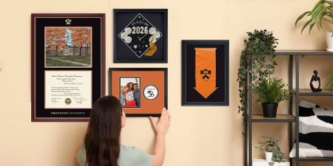 college student hanging custom photo frame on gallery wall featuring grad cap shadow box frame, graduation stole frame, and Princeton University campus scene diploma frame