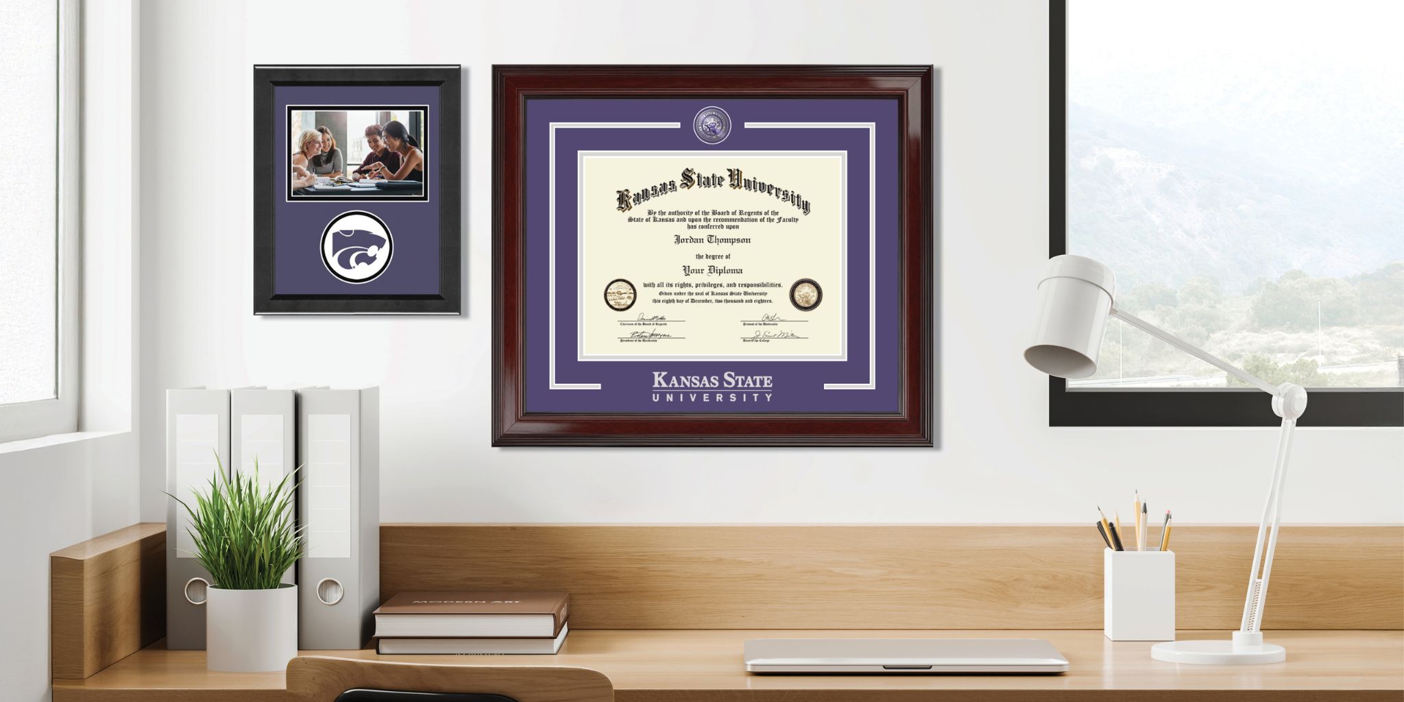 Kansas State University diploma frame and photo frame hanging above desk in office
